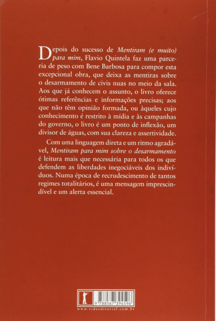 Depois do sucesso de Mentiram (e muito) para mim, Flavio Quintela faz uma parceria de peso com Bene Barbosa para compor esta excepcional obra, que deixa as mentiras sobre o desarmamento de civis nuas no meio da sala. Aos que já conhecem o assunto, o livro oferece ótimas referências e informações precisas aos que não têm opinião formada, ou àqueles cujo conhecimento é restrito à mídia e às campanhas do governo, o livro é um ponto de inflexão, um divisor de águas, com sua clareza e assertividade.